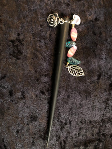 Roses and Czech Glass Leaves Dangly Wooden Hair Stick - Black